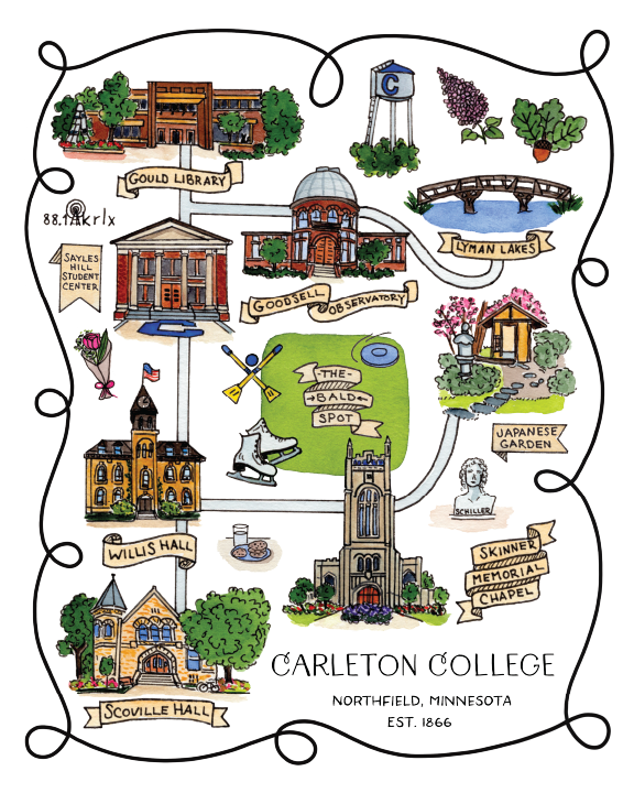 Magnets and Stickers - Illustrated Map of Carleton College - Ships Free