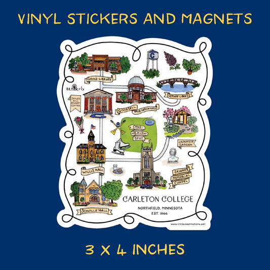 Magnets and Stickers - Illustrated Map of Carleton College - Ships Free