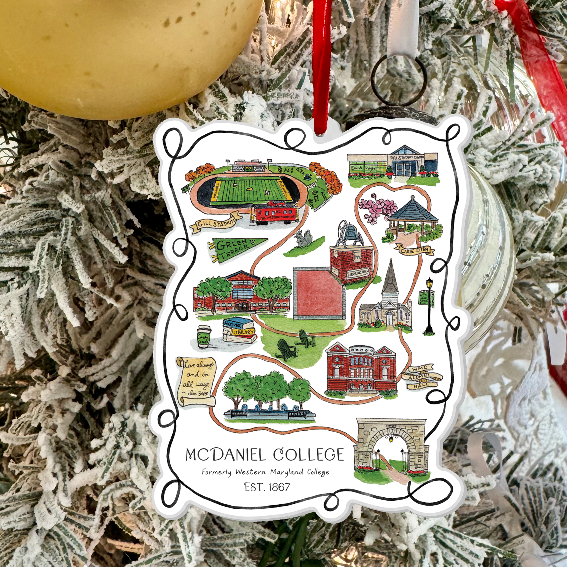 This ornament features a watercolor painting by artist Stephanie Madsen that showcases special spots on McDaniel College's campus in Westminster, Maryland. This college, formerly known as Western Maryland College, was established in 1867 and is known for its high-quality liberal arts education within a close community.